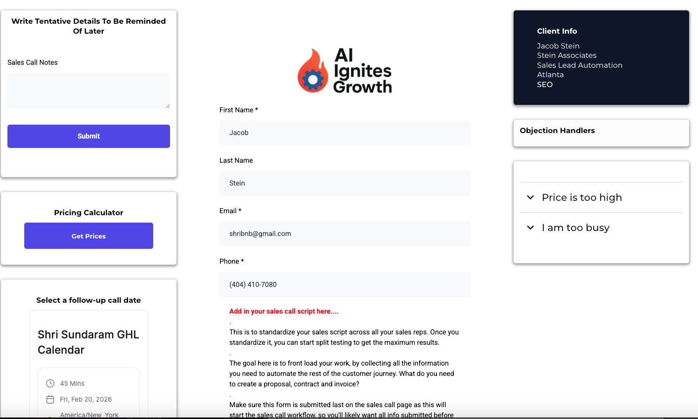 The journey begins with a standardized Sales Dashboard. Instead of manual data entry, the system pulls the prospect's contact info directly from our database.